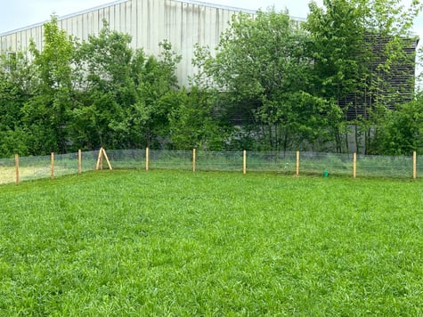 Der erste Arbeitstag ist vorbei und der Platz kann sich langsam sehen lassen. Das Gras wächst, die Pfähle für den Zaun stehen und auch ein Container ist bereits vor Ort.